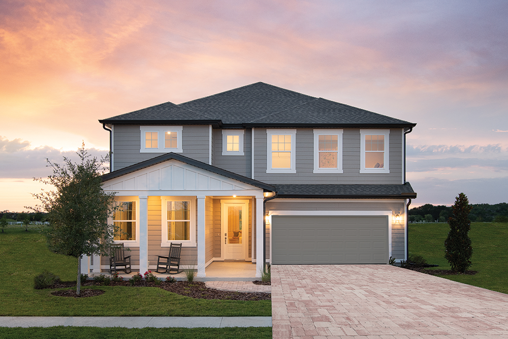 The popular Duval II plan features a large kitchen with island and breakfast nook anchoring the open main floor, while a second-floor loft overlooks the family room below. The private primary suite, first-floor guest suite, optional butler's pantry, and tandem garage space add convenience and luxury to this spacious plan.
